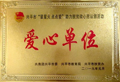 2019年1月,在興平市“星星火,點(diǎn)點(diǎn)愛(ài)”助力脫貧微心愿認(rèn)領(lǐng)活動(dòng)中,寶塔山漆被共青團(tuán)興平市委、興平市教育局、興平市扶貧辦評(píng)為“愛(ài)心單位”